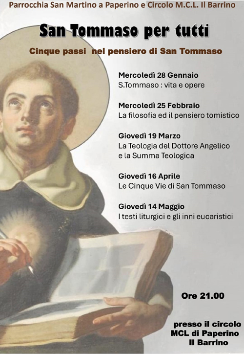 Organizzato dalla Parrocchia di San Martino a Paperino, nei locali del circolo MCL "Il Barrino" alle ore 21,00, si terranno gli incontri " San Tommaso per tutti, cinque passi nel pensiero di San Tommaso".